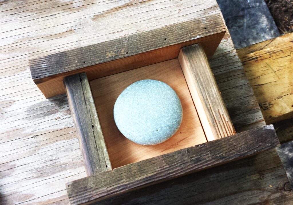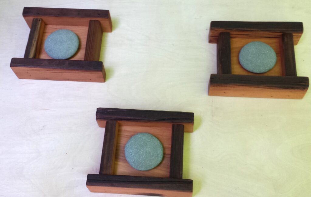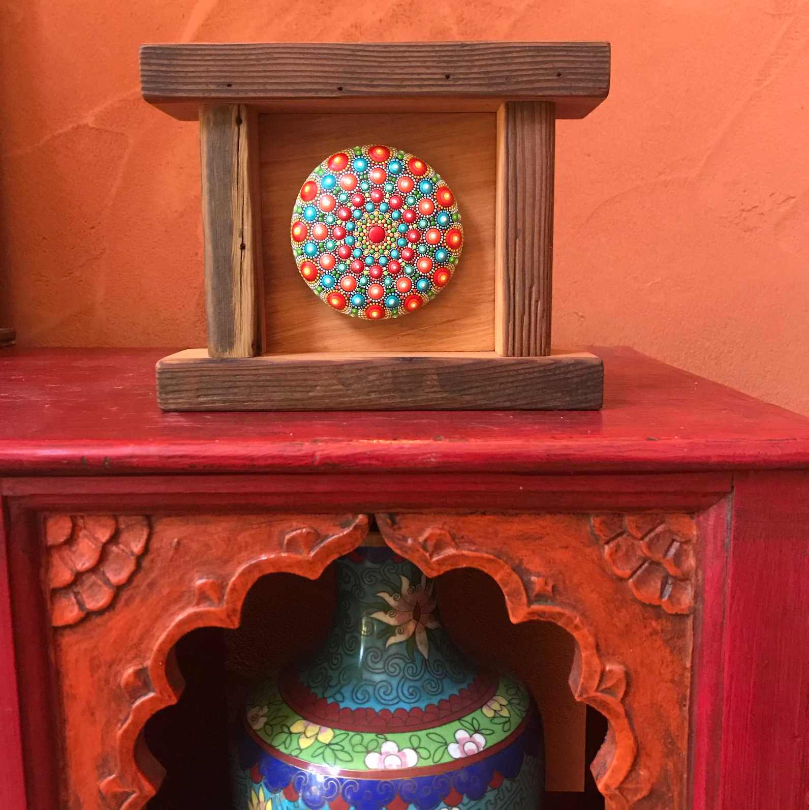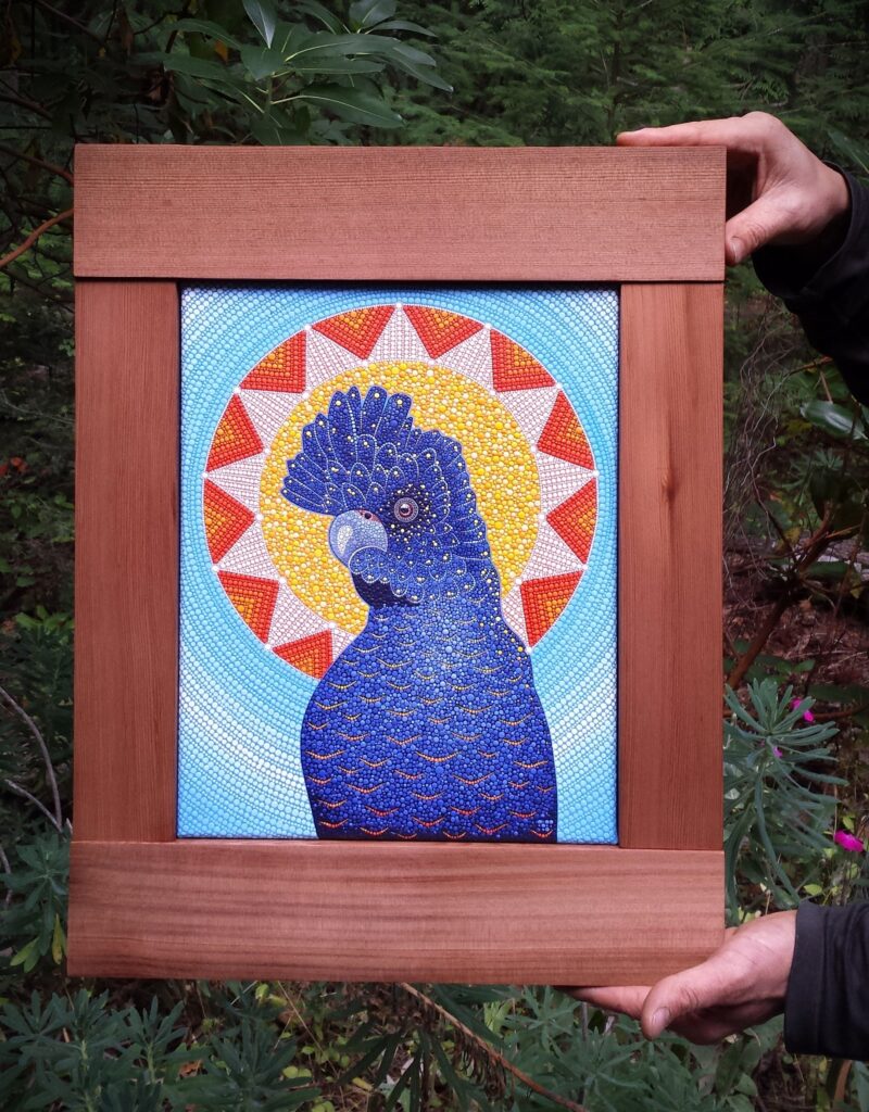 The frames for the Mandala stones are made from reclaimed, spalted (which is what gives it the unique colors and patterns), old-growth fir from an old deck. I saved this wood from being hauled to the land-fill, dried it and use it for special artistic projects and finish details. The cockatoo Dotillism piece frame was made from a small piece of clear, salvage cedar that had just the right grain pattern and colour tones.